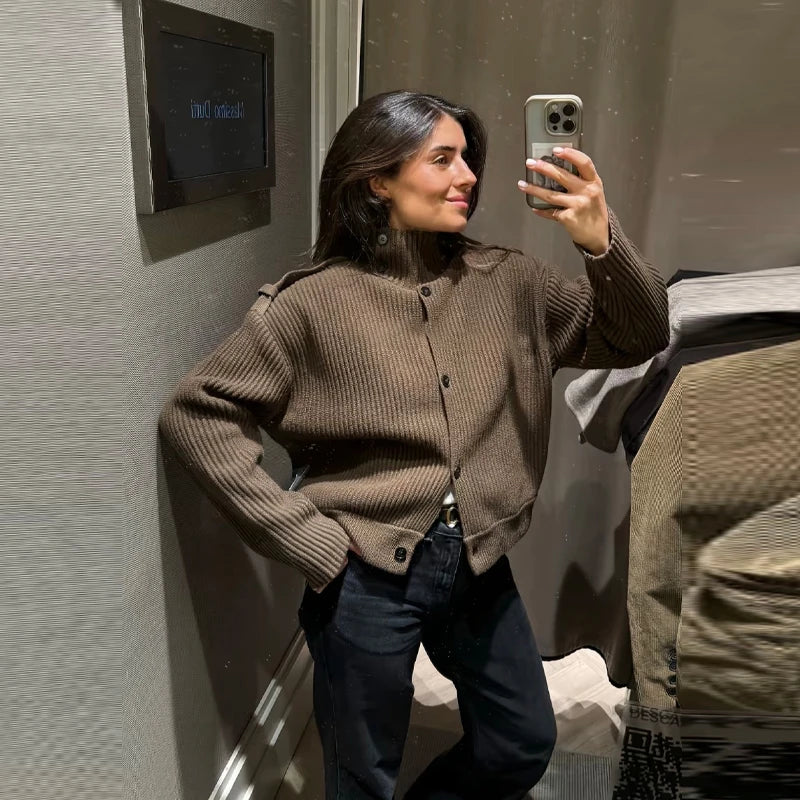 **Product Overview** Meet the ultimate "throw-on-and-go" layer that bridges the gap between cozy loungewear and high-end fashion. This piece is designed to be your wardrobe’s secret weapon for effortless seasonal transitions. It is a beautifully textured, knitted outer layer featuring a contemporary relaxed fit and a distinctive stand collar that instantly elevates a basic outfit. Unlike standard V-neck styles, the high neckline adds a touch of architectural structure, framing your face elegantly while blocking out chilly breezes. With a single-breasted button-down front, full-length sleeves, and a trendy drop-shoulder design, it offers a silhouette that is slouchy enough to be comfortable but polished enough for the office. Available in rich, earthy tones, this knitwear is substantial enough to act as a light jacket in spring or a snuggly indoor layer when the air conditioning is on full blast. **Target Audience** This collection is curated for the modern woman who refuses to sacrifice comfort for style. It is specifically designed for the busy professional who needs a chic layer for a freezing office, the student rushing to class who wants a trendy outfit in seconds, or the "clean girl" minimalist building a versatile capsule wardrobe. If you are someone who feels overwhelmed by the morning rush and hates clothing that feels tight or restrictive, this is for you. It appeals directly to women who want to look "put together" without the effort—those who need a garment that pairs just as effortlessly with high-waisted jeans and boots as it does with leggings for a quick coffee run. **Key Features and Benefits** * **The "Architectural" Stand Collar:** The raised neckline provides immediate polish and a high-fashion look that eliminates the need for a scarf. It frames the face beautifully, making you look ready for a Zoom call or a dinner date instantly. * **Non-Cling, Relaxed Fit:** Designed with a generous drape (bust measurements spanning 112cm to 124cm), this garment floats over the body rather than squeezing it. It offers a "bloat-friendly" fit that boosts confidence on days when you want coverage without looking shapeless. * **Versatile 2-in-1 Styling:** The functional button-down front allows you to wear it fully buttoned as a structured sweater or open as a breezy